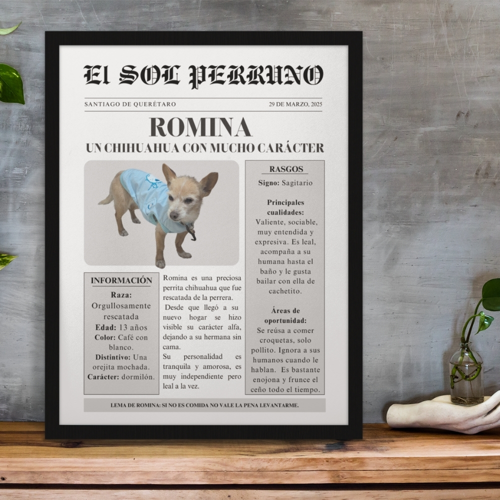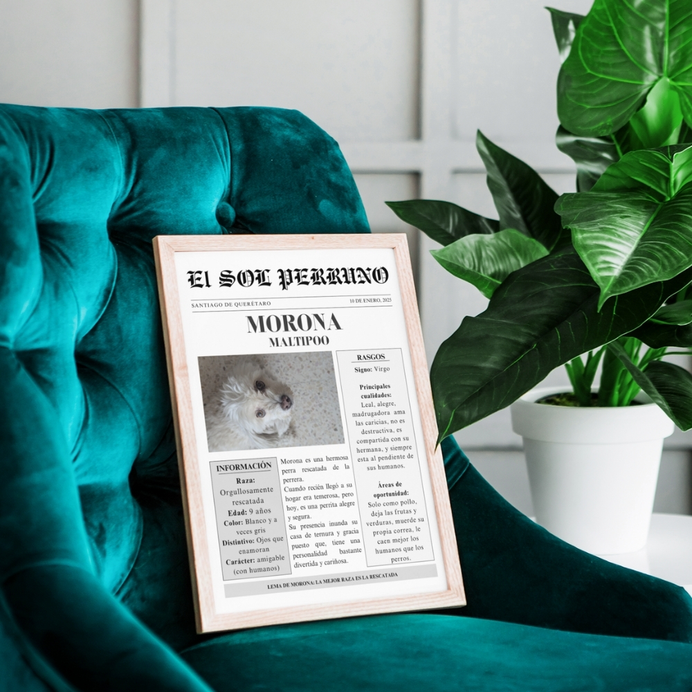El cuadro incluye un marco ligero que se puede colgar o colocar sobre cualquier mueble, y la impresión con acabado mate pensada para evitar reflejos y garantizar la durabilidad. El diseño de un periódico clásico pero con la portada estelar de tu mascota, busca mostrar de forma tierna y divertida esos pequeños detalles que vuelven tan único a tú lomito🐾✨.